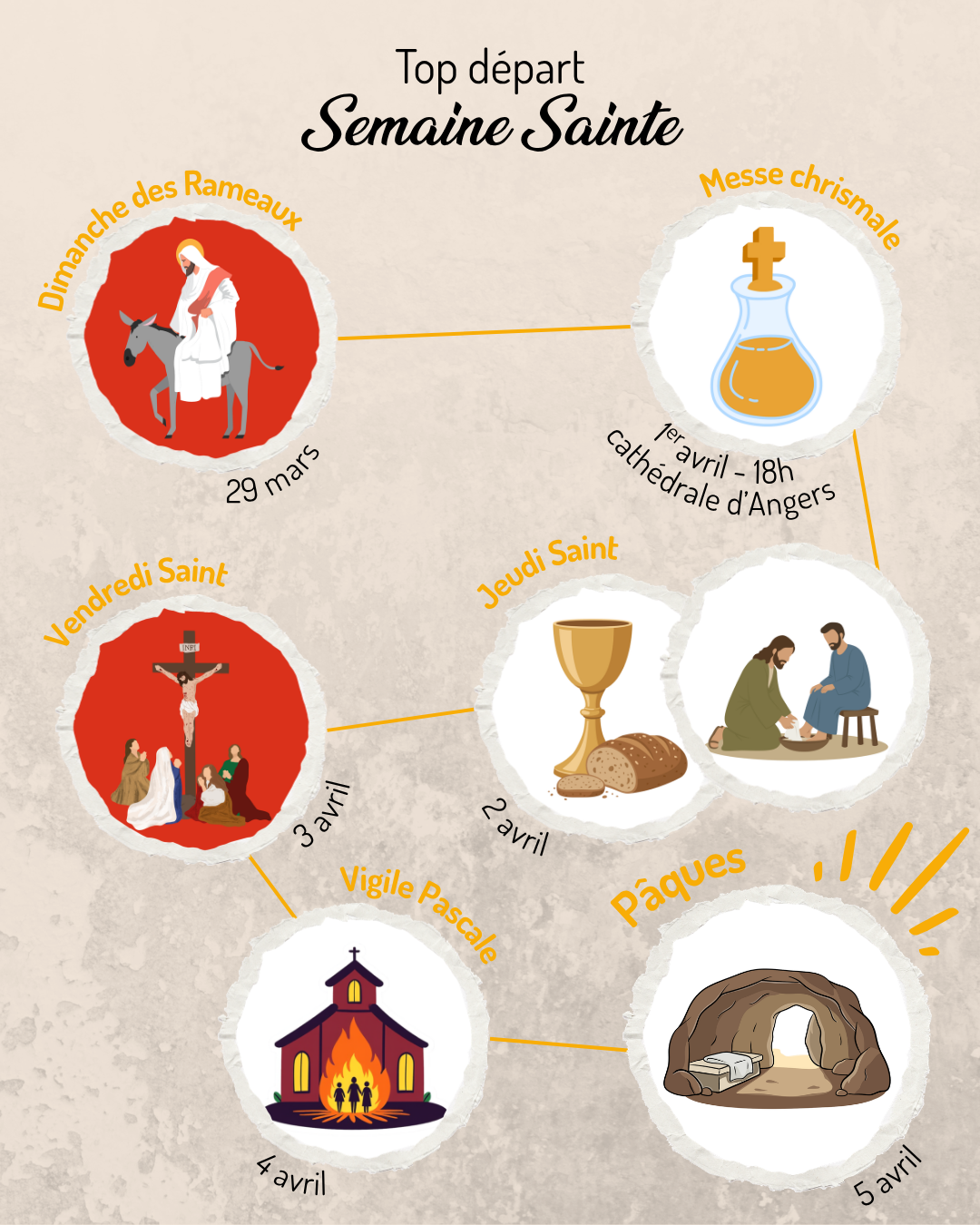 Cette semaine s’articule surtout autour de trois jours : le jeudi, le vendredi et le samedi. On appelle ces trois jours le triduum pascal. C’est aussi durant cette semaine que l’on célèbre la messe Chrismale. Chacun y est invité et elle aura lieu pour notre diocèse mercredi 1er avril à 18h à la cathédrale Saint-Maurice d’Angers. Elle sera aussi retransmise sur les ondes de RCF Anjou !