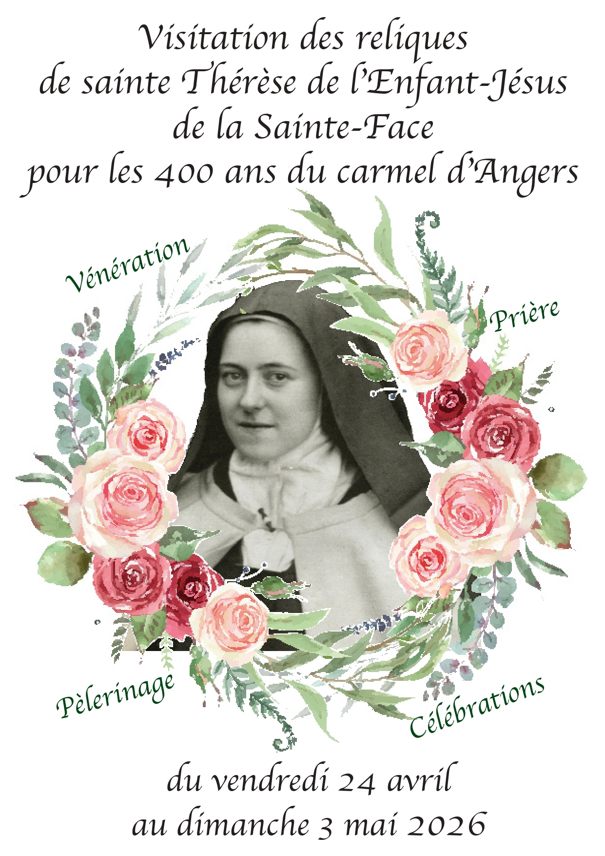 À l’occasion des 400 ans de présence du Carmel d’Angers, les reliques de sainte Thérèse de l’Enfant‑Jésus et de la Sainte‑Face (« la petite Thérèse », dite aussi « Thérèse de Lisieux ») sont à Angers et aux alentours.