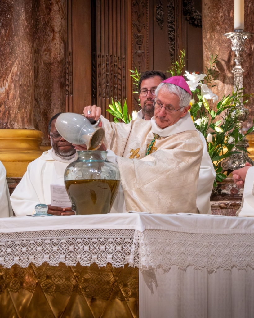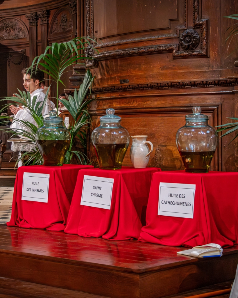 Durant la messe chrismale, l’évêque bénit les huiles saintes et consacre le Saint Chrême. Cette huile servira dès les baptêmes de Pâques puis tout au long de l’année pour les sacrements du baptême, de la confirmation et de l’ordre.